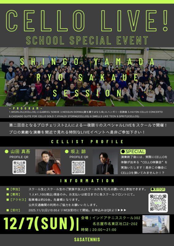 プロチェリストによる生演奏をインドアテニスコートでお届けいたします✨️