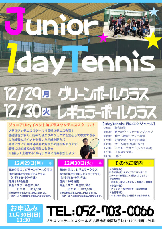 申込 :11/30(日)13:30~プラスワンテニススクールへお電話にて受付開始